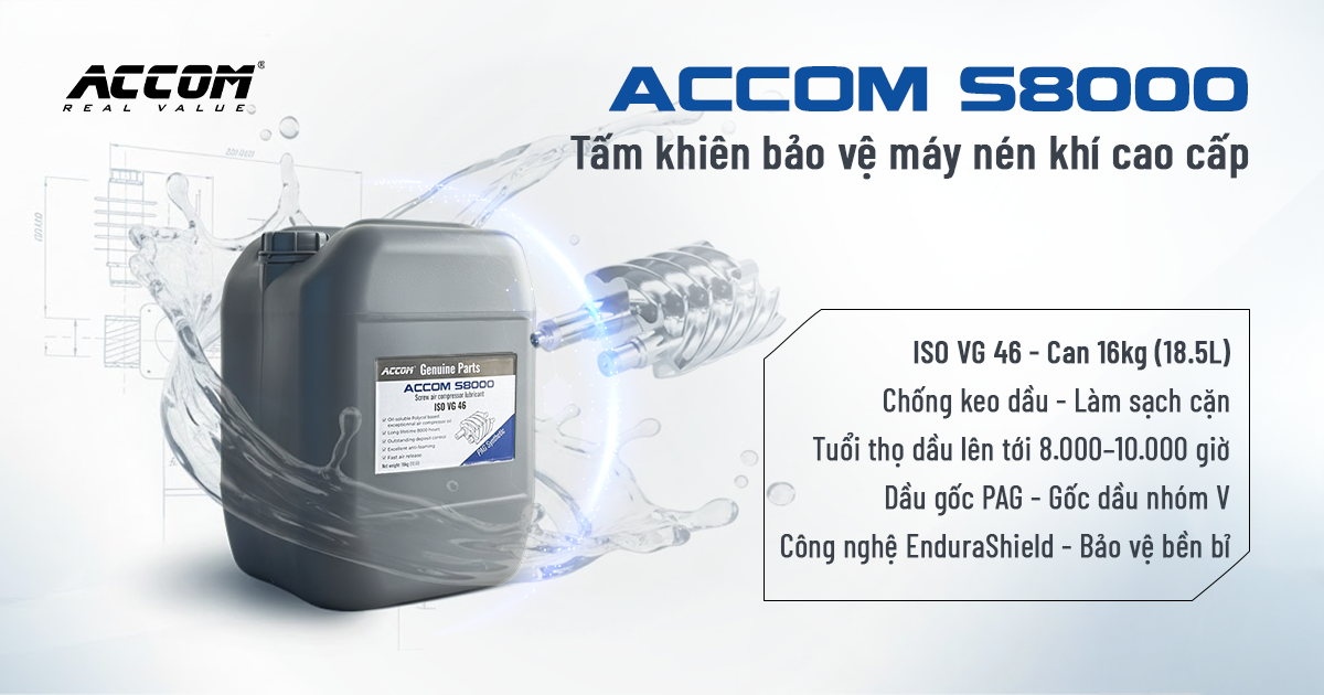 ACCOM S8000 là dòng dầu được làm ra cho máy nén khí chạy nặng, chạy lâu, chạy liên tục.