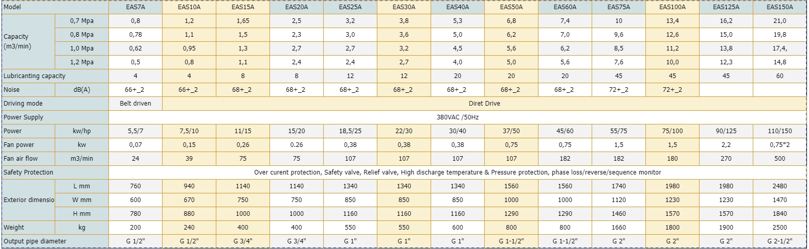 | Model | áp suất | EAS7A | EAS10A | EAS15A | EAS20A | EAS25A | EAS30A | EAS40A | EAS50A | EAS60A | EAS75A | EAS100A | EAS120A | EAS150A |