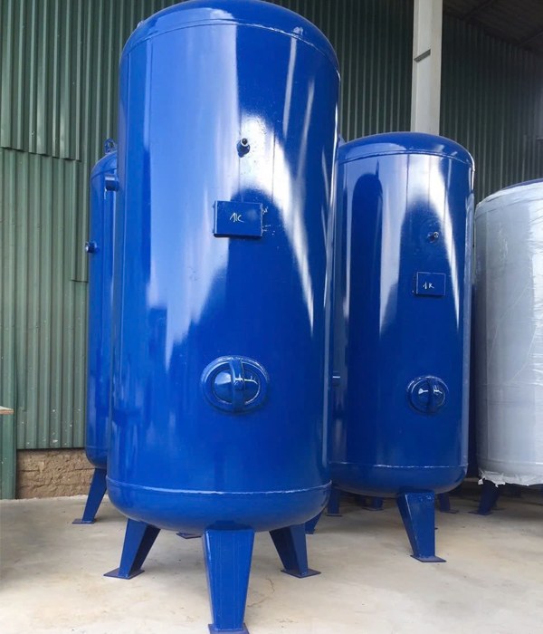 - Cấu tạo: Thân bình chứa khí nén hình trụ, đáy cong dạng elip, có thể thiết kế dạng đứng hoặc nằm ngang