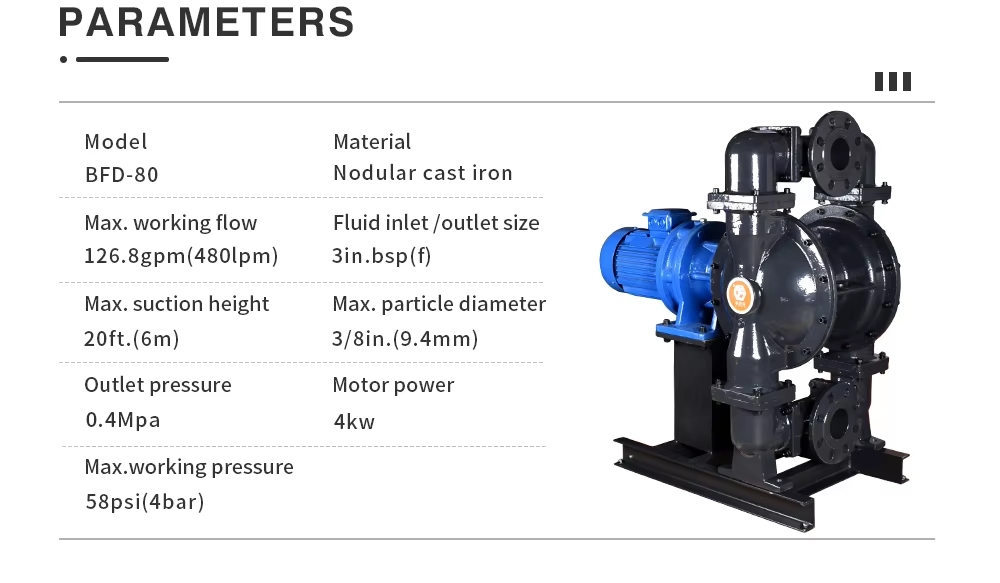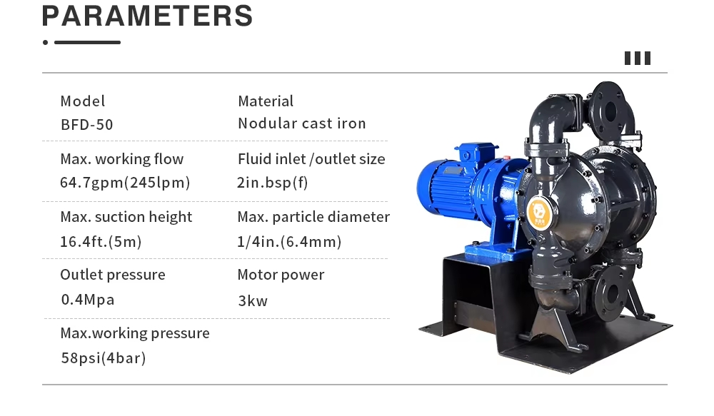 Bơm màng điện Godo BFD Series với thân gang cầu (Nodular Cast Iron) là dòng sản phẩm vượt trội, được thiết kế đặc biệt cho các ứng dụng công nghiệp yêu cầu độ bền cao, khả năng chống mài mòn tốt và khả năng chịu lực mạnh. Với chất liệu gang cầu, dòng bơm này không chỉ nâng cao hiệu suất mà còn đảm bảo tuổi thọ lâu dài trong môi trường làm việc khắc nghiệt. Thân bơm gang cầu mang lại sự linh hoạt và độ bền cao hơn so với các loại gang thông thường, rất thích hợp cho việc bơm các chất lỏng chứa hạt rắn, hóa chất, và trong các hệ thống xử lý bùn, dầu mỡ trong ngành công nghiệp.