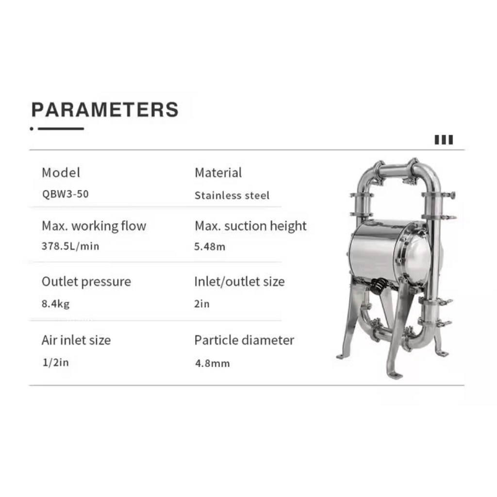 Bơm màng khí nén QBW3 Sanitary là giải pháp hoàn hảo cho các ứng dụng đòi hỏi tiêu chuẩn vệ sinh khắt khe nhất, như trong ngành thực phẩm, đồ uống và dược phẩm. Với thiết kế tinh xảo, vật liệu cao cấp và hiệu suất vượt trội, QBW3 Sanitary đảm bảo an toàn vệ sinh tuyệt đối cho sản phẩm của bạn.