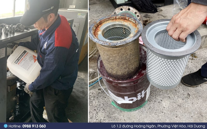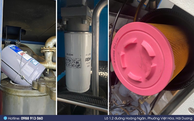 Quan sát thực tế là cách đơn giản giúp phát hiện các dấu hiệu hư hỏng. Nếu lọc khí bị bám bụi dày, dầu máy chuyển sang màu đen hoặc sẫm hơn so với ban đầu, hoặc máy có dấu hiệu tụt áp, hãy tiến hành thay thế ngay để đảm bảo hệ thống hoạt động ổn định.