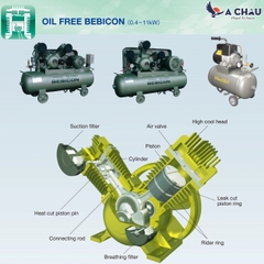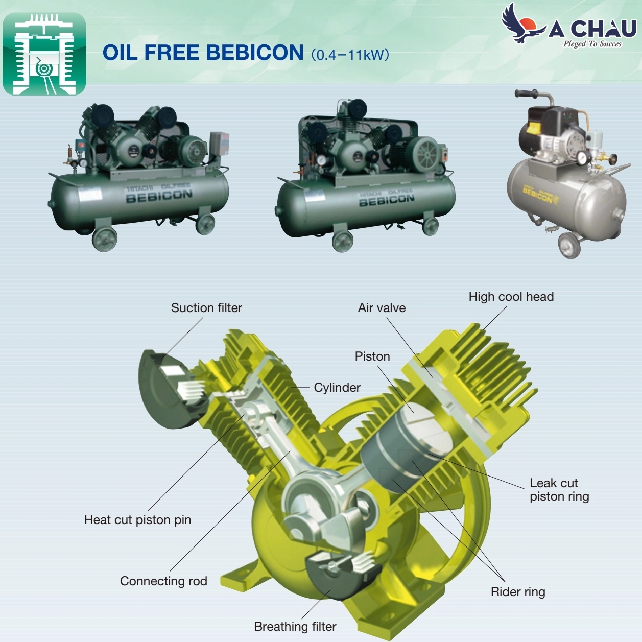 - Hệ thống bôi trơn không dầu, đảm bảo khí nén đầu ra tinh khiết 100%, phù hợp với các tiêu chuẩn nghiêm ngặt về vệ sinh và an toàn.
