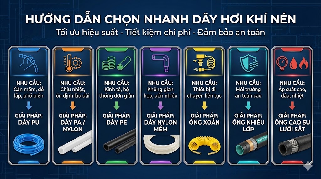 Dây hơi khí nén là thành phần không thể thiếu trong mọi hệ thống khí nén, đóng vai trò dẫn truyền khí từ máy nén đến thiết bị sử dụng như xy lanh, van, súng hơi, máy móc tự động. Việc lựa chọn đúng loại dây hơi giúp hệ thống vận hành ổn định, an toàn, hạn chế rò rỉ và kéo dài tuổi thọ thiết bị.