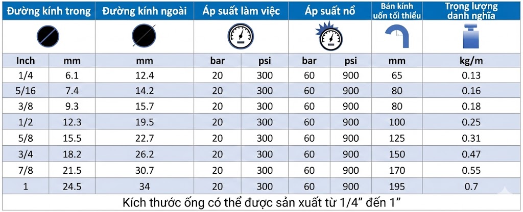 Lưu ý: Phù hợp cho khí nén và dầu. Cần lựa chọn đúng áp suất làm việc theo hệ thống thực tế để đảm bảo an toàn.