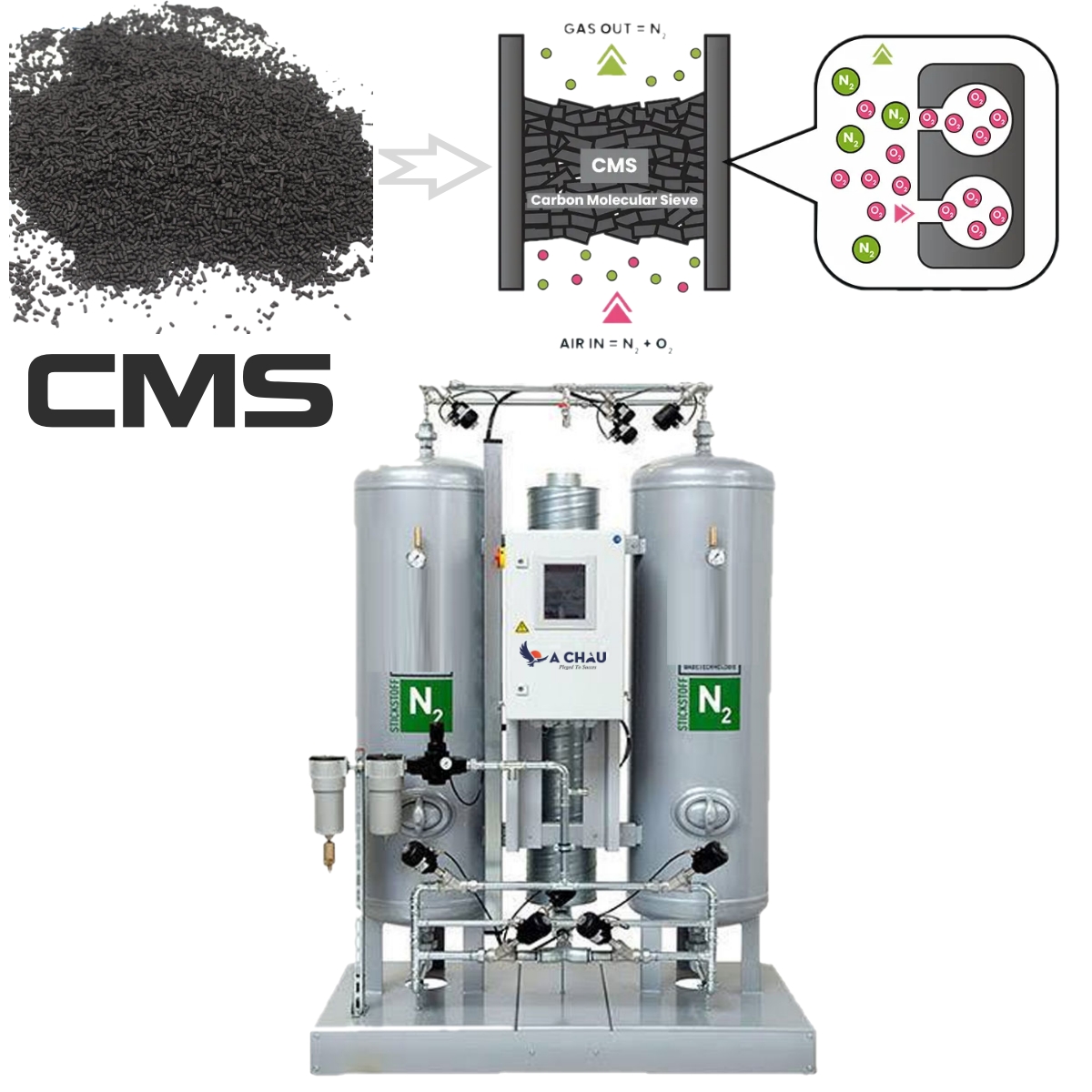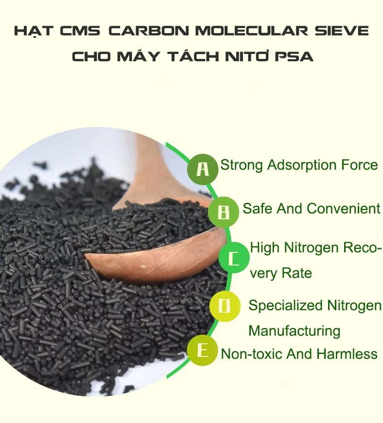Hạt CMS (Carbon Molecular Sieve) là vật liệu chuyên dụng trong công nghệ tách khí nitơ bằng phương pháp PSA (Pressure Swing Adsorption). Đây là thành phần cốt lõi giúp phân tách khí nitơ và oxy dựa trên sự khác biệt về kích thước phân tử. Với tính năng vượt trội, hạt CMS được ứng dụng rộng rãi trong các ngành công nghiệp, y tế và nhiều lĩnh vực đặc thù yêu cầu khí nitơ tinh khiết.