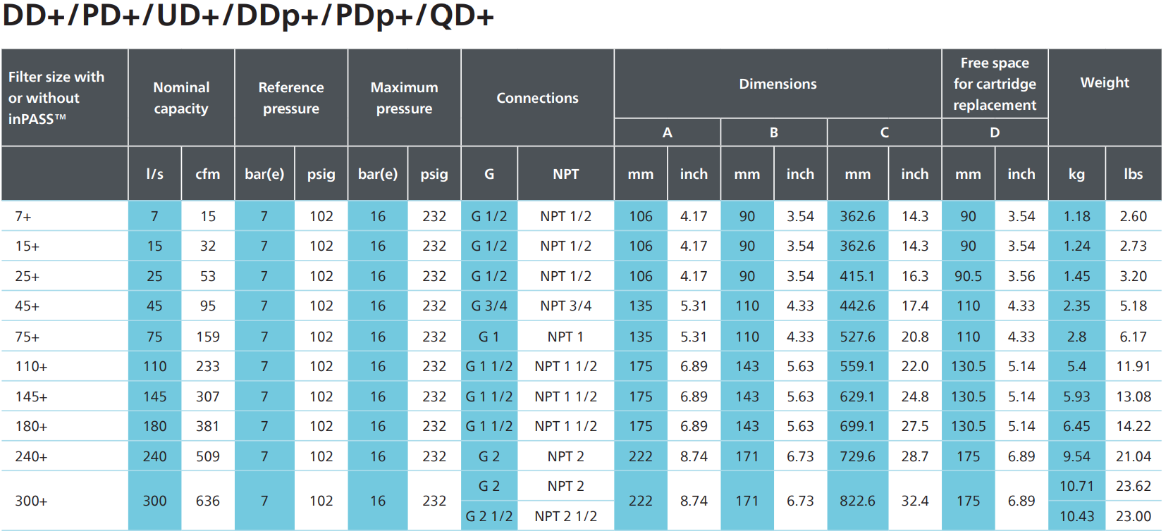 - Các cụm lọc dòng DD+ / PD+ / UD+ / DDp+ / PDp+ / QD+ (tùy cấu hình bầu lọc tương ứng)