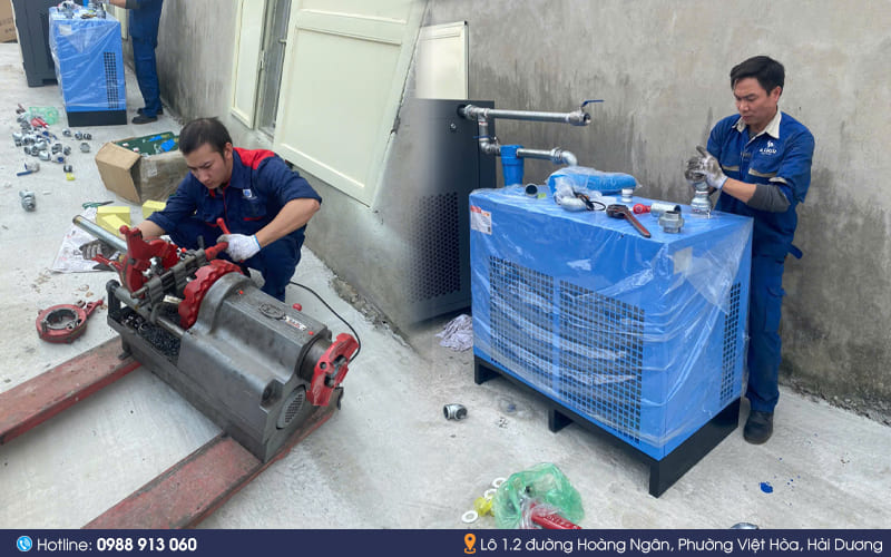 - Đấu nối điện, lắp đặt đường ống khí nén, hiệu chỉnh và cố định máy.