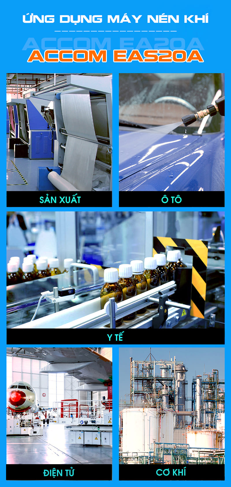 Câu hỏi 4: Máy nén khí ACCOM EAS20A 15kW có thể sử dụng cho những ngành nghề nào?