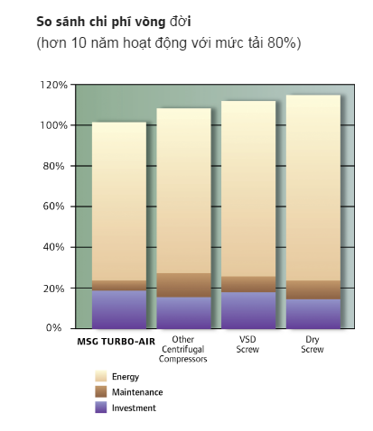 - MSG TURBO-AIR 3000 cung cấp một số tổng chi phí vòng đời thấp bao gồm vít khô, vít truyền động biến tốc (VSD) và máy nén ly tâm khác.
