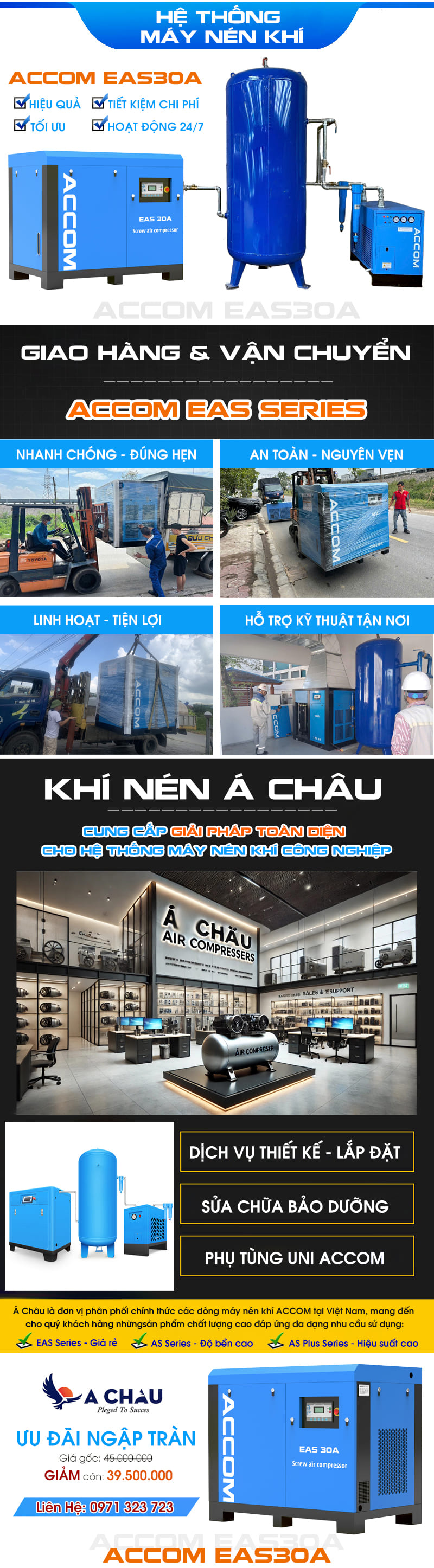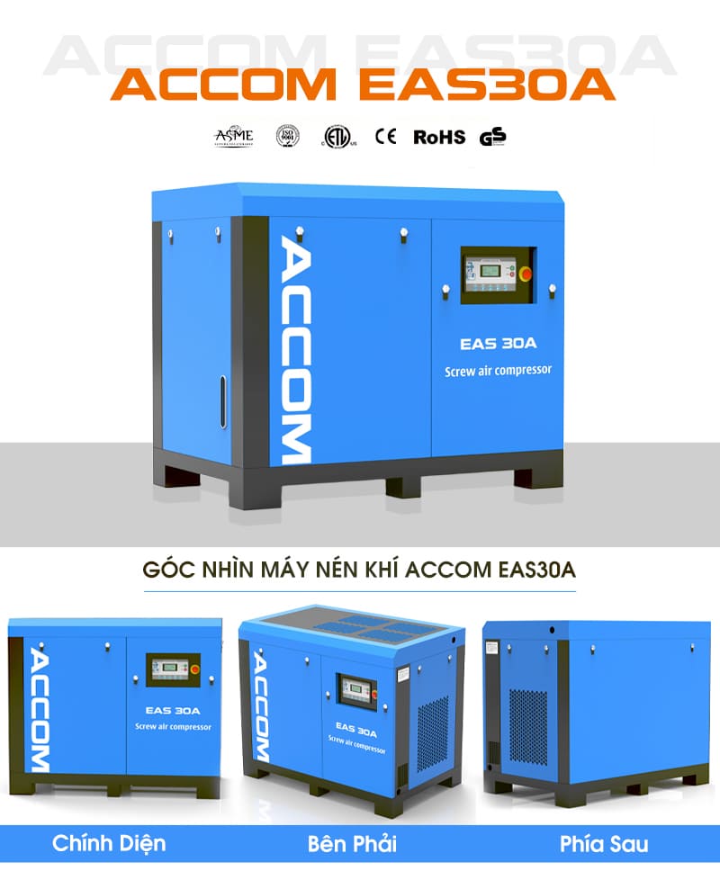 Máy nén khí ACCOM EAS30A 22kW giúp xưởng sản xuất của bạn hoạt động ổn định, giảm chi phí điện năng và bảo trì. Liên hệ ngay với Á Châu 0971 323 723 để nhận tư vấn chuyên sâu và báo giá tốt nhất!