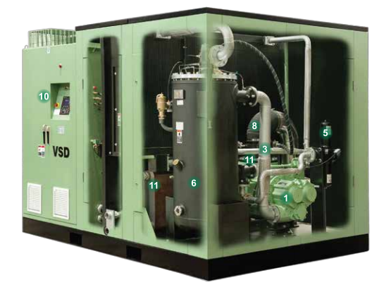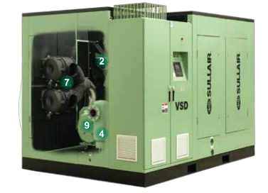 - Đầu khí nén của máy nén khí trục vít Sullair sử dụng các cánh quạt được ghép nối và xử lý với độ chính xác cao.