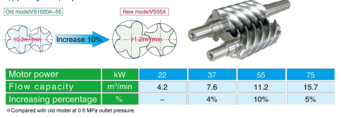 - Máy nén khí trục vít Kobelco- Kobelion VS/AG đạt lưu lượng khí đầu ra vượt qua các đối thủ cạnh tranh cùng công suất bằng cách phát triển cặp trục vít với công nghệ mới nhất.