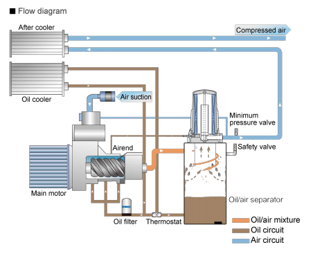 - Sơ đồ nguyên lý hoạt động của tất cả các dòng máy nén khí Kobelco đời mới hiện nay được đơn giản hết mức nhằm tăng hiệu suất máy để dễ dàng sử dụng, quản lý.