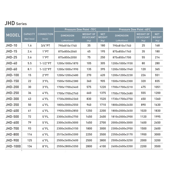 Thông số kỹ thuật máy sấy khí hấp thụ Jmec JHD series