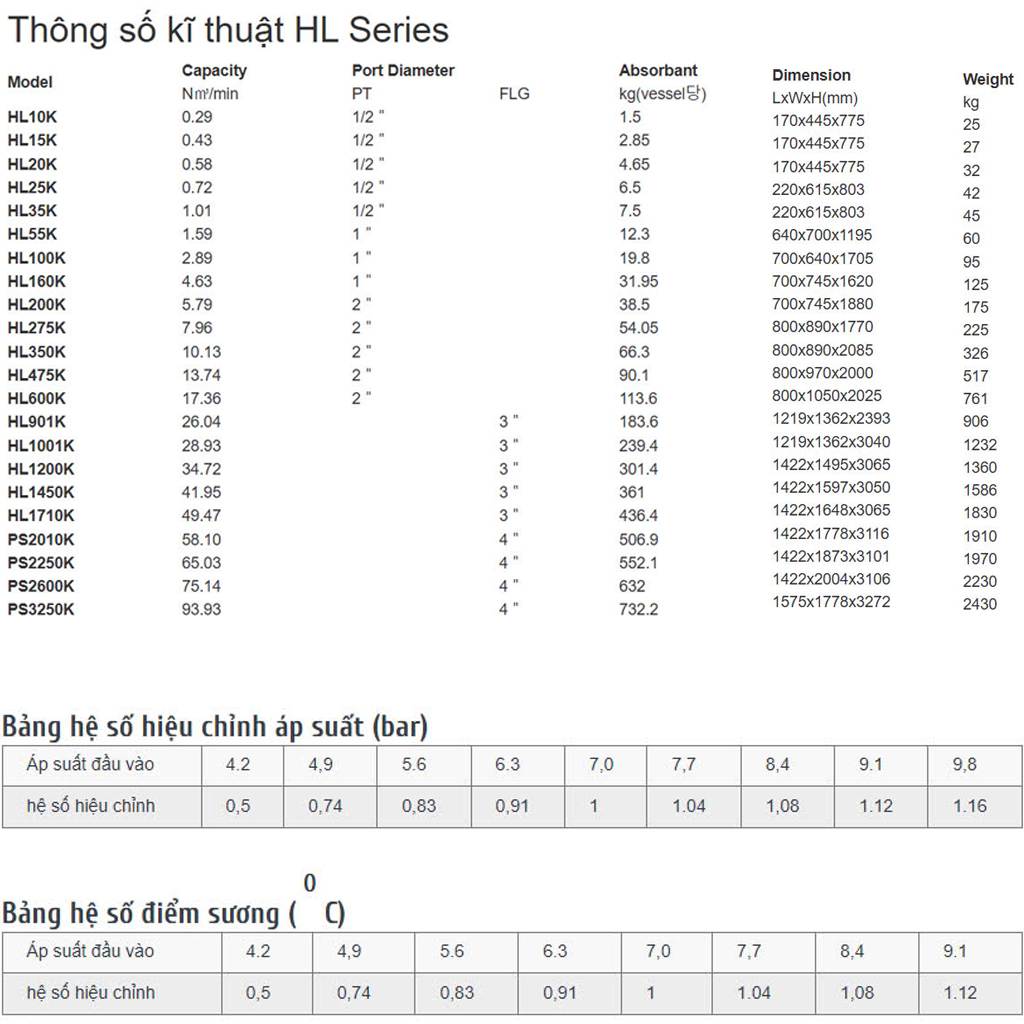 Thông số kỹ thuật máy sấy khí hấp thụ Kyungwon HL series