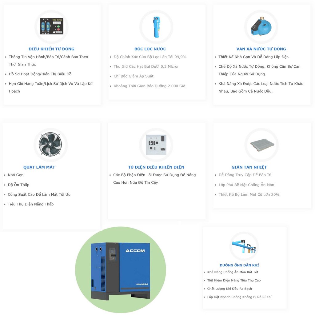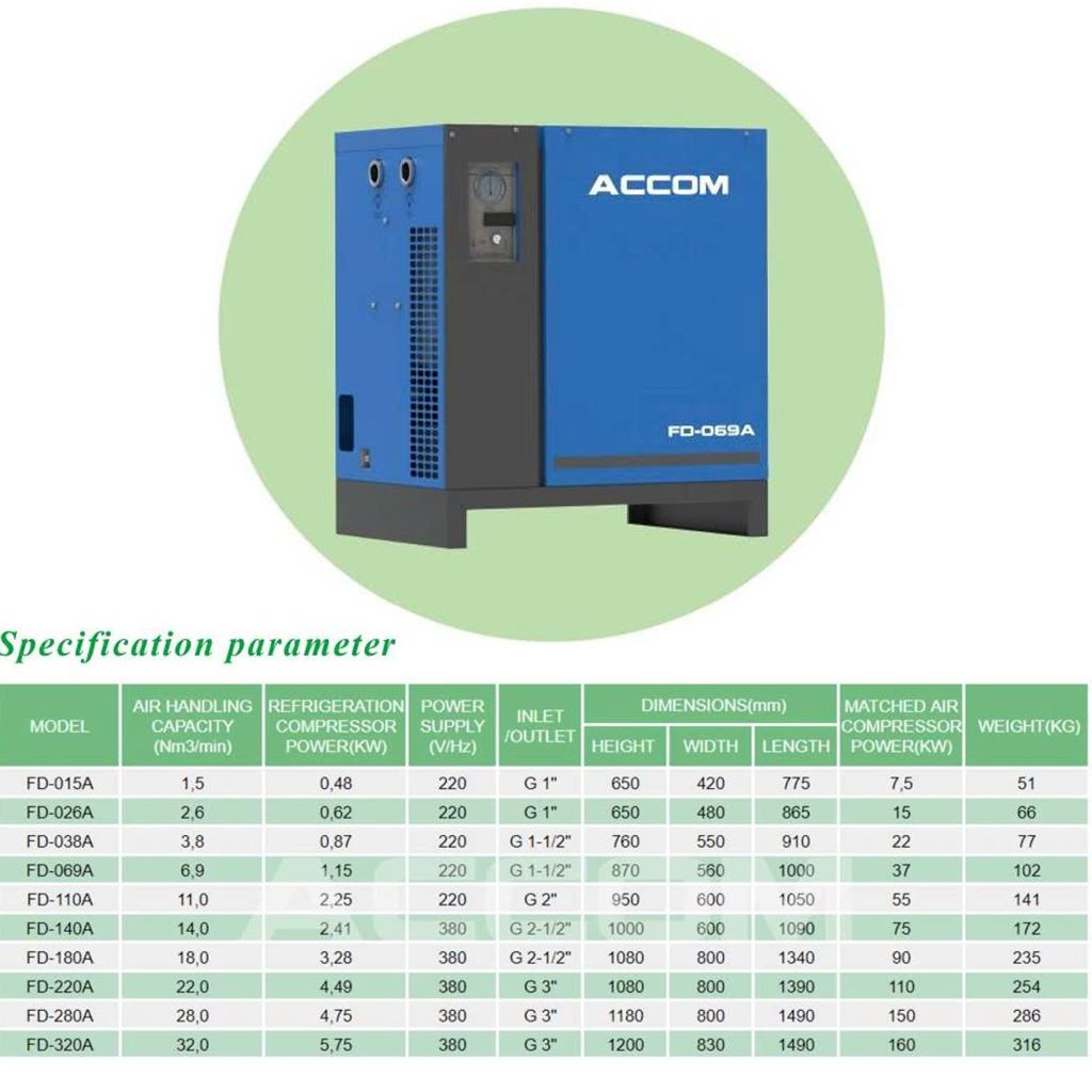ACCOM xin giới thiệu dòng máy sấy khí tác nhân lạnh làm mát bằng không khí FD-A Series, giải pháp lý tưởng cho các hệ thống khí nén yêu cầu độ tin cậy cao, hiệu suất ổn định và chi phí vận hành thấp. FD-A Series được thiết kế để loại bỏ hiệu quả hơi ẩm trong khí nén, bảo vệ hệ thống và nâng cao chất lượng sản phẩm.