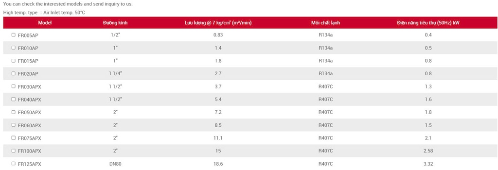 Thông số kỹ thuật máy sấy khí tác nhân lạnh Fusheng FR Series