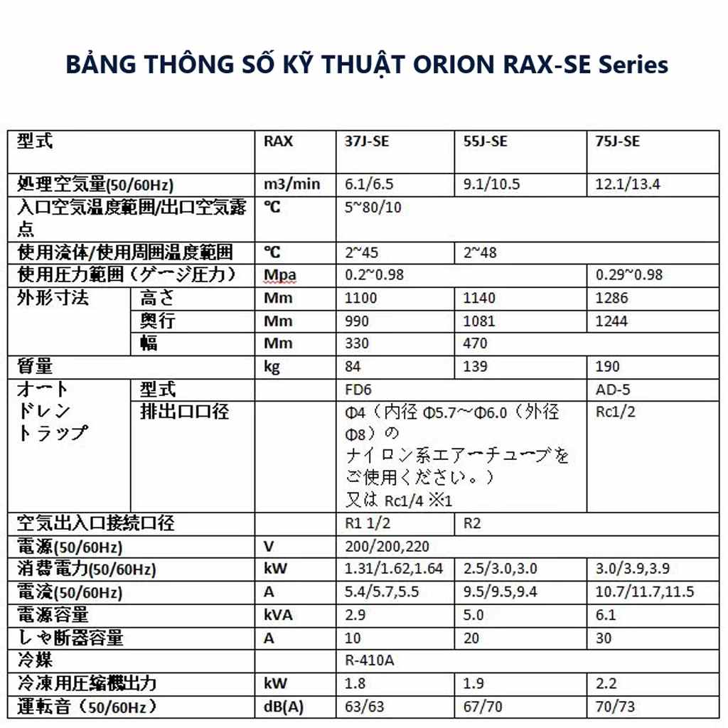 Thông số kỹ thuật máy sấy khí tác nhân lạnh Orion RAX-SE Series