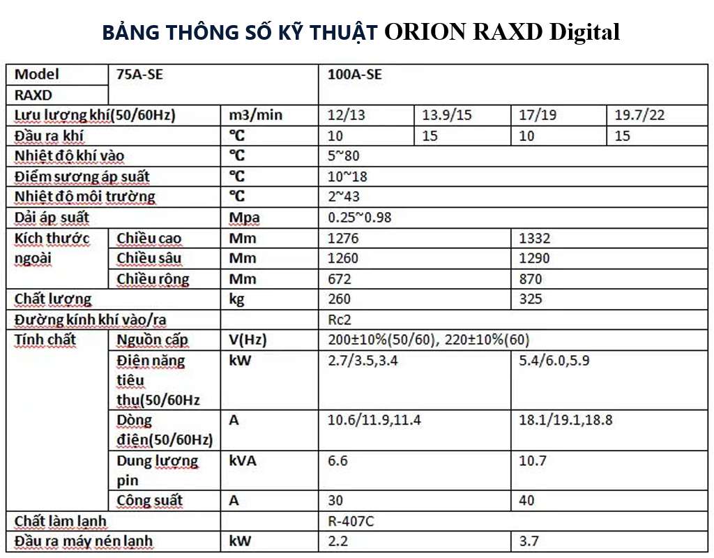 Thông số kỹ thuật máy sấy khí tác nhân lạnh ORION RAXD Digital