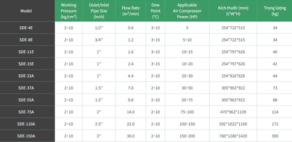 Thông số kỹ thuật máy sấy khí tác nhân lạnh Swan SDE Series