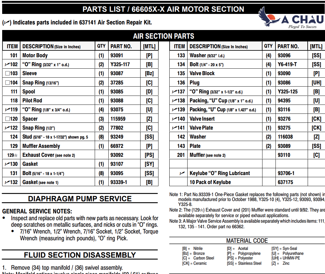 Nhóm phụ tùng cho dòng bơm ARO 66610X-X-C hoặc các dòng bơm màng 1 inch.
