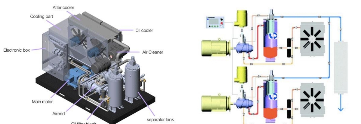 - Quạt làm mát: Làm giảm nhiệt độ dầu và khí trong máy nén.