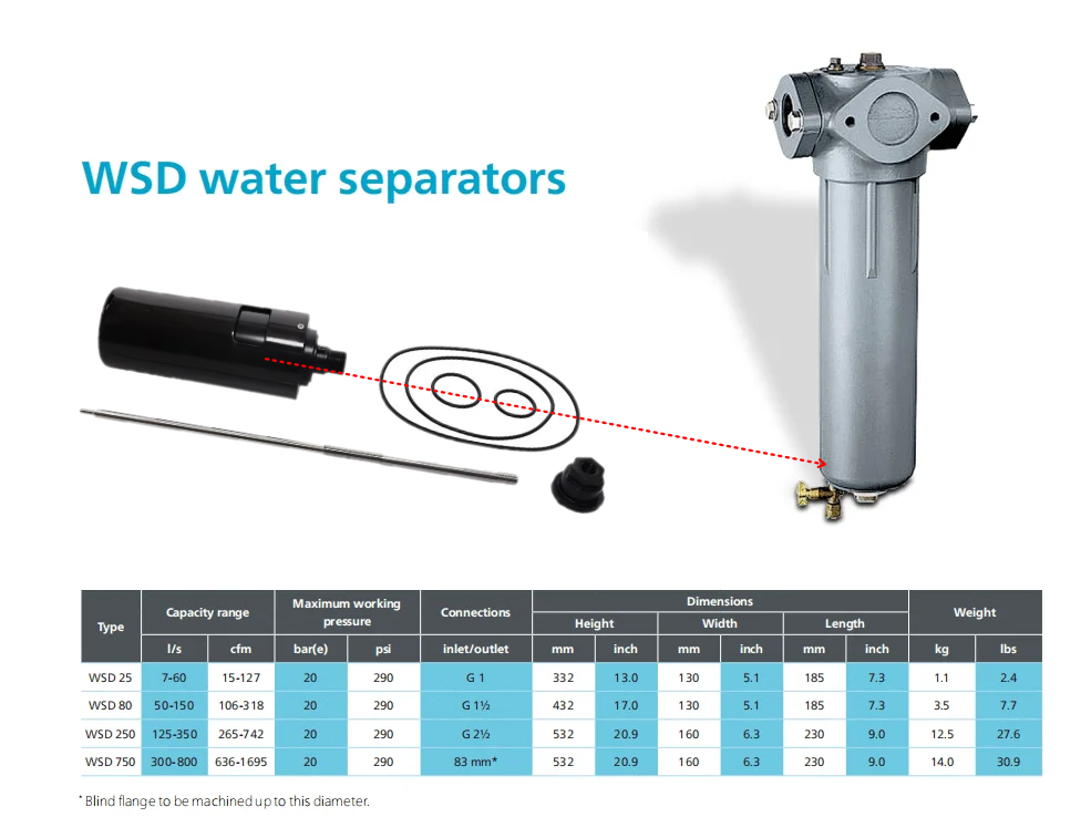 Bộ tách nước WSD có nhiệm vụ loại bỏ nước ngưng ngay sau máy nén, trước khi khí đi vào aftercooler, máy sấy khí và hệ thống lọc đường ống. Do làm việc trực tiếp với lượng nước ngưng lớn và liên tục, cụm xả nước của WSD là bộ phận cần được kiểm tra và thay thế định kỳ.