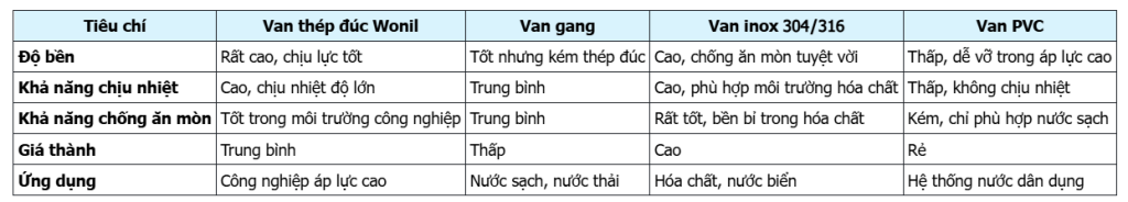 So sánh van một chiều thép đúc Wonil với các loại van khác